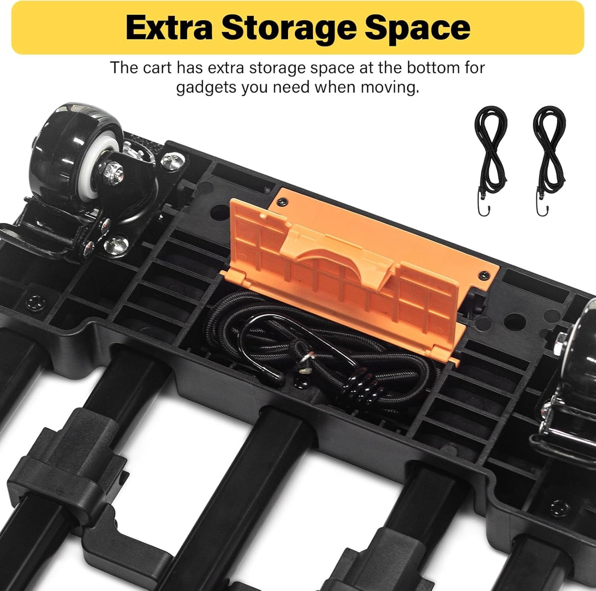 – Extra Storage Box At the bottom of the moving dolly, there is additional storage to hold elastic straps or other small tools for moving